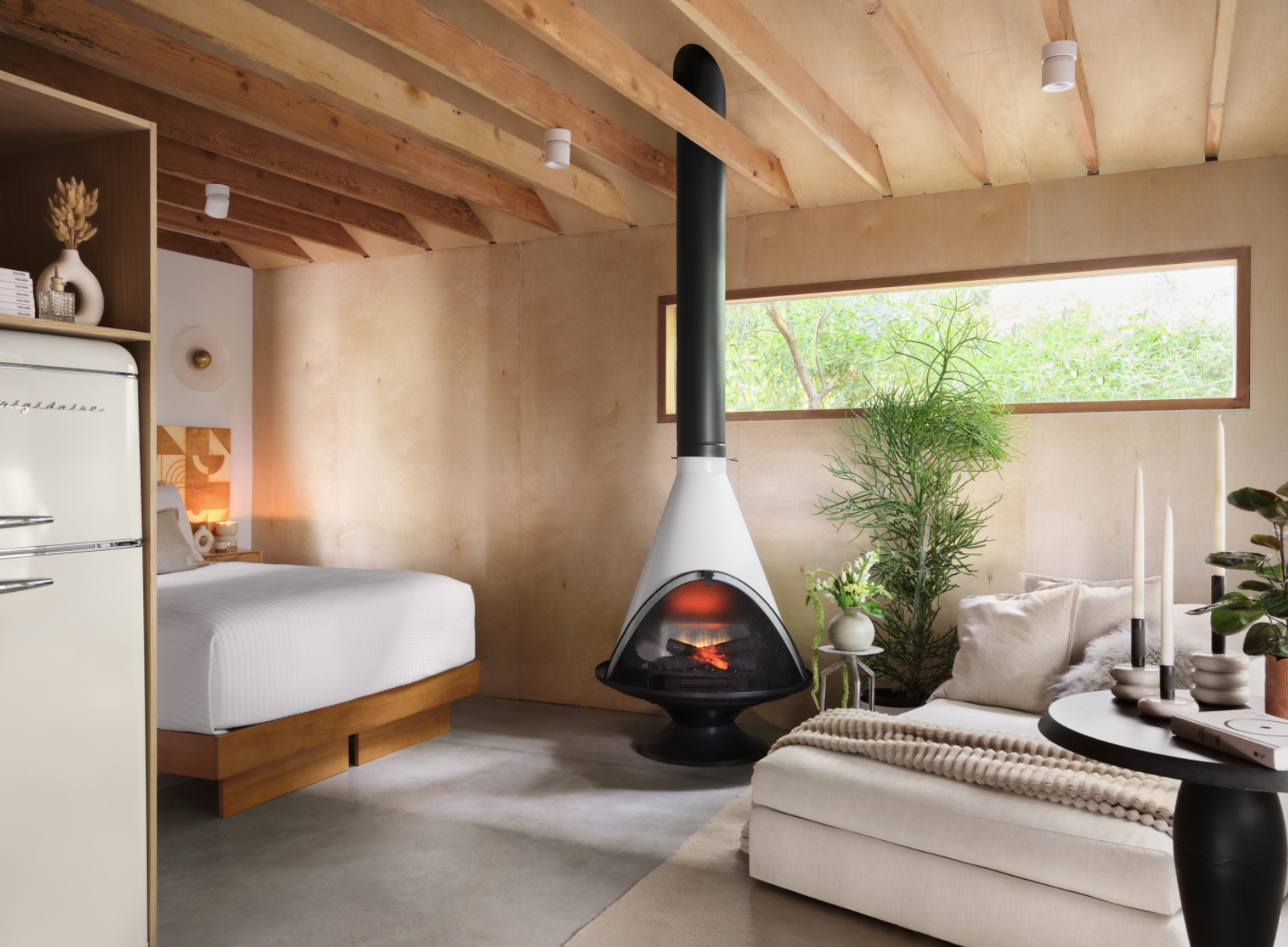 Nestled in the trees, this Scandinavian studio with concrete floors, birch walls, mid century fireplace, white oak cabinetry, soft neutral palette is the perfect place to disconnect. Cozy up In front of the mid century fireplace or watch your favorite movie in the ultra-soft Beauty Rest bed, 100% linen bedding.