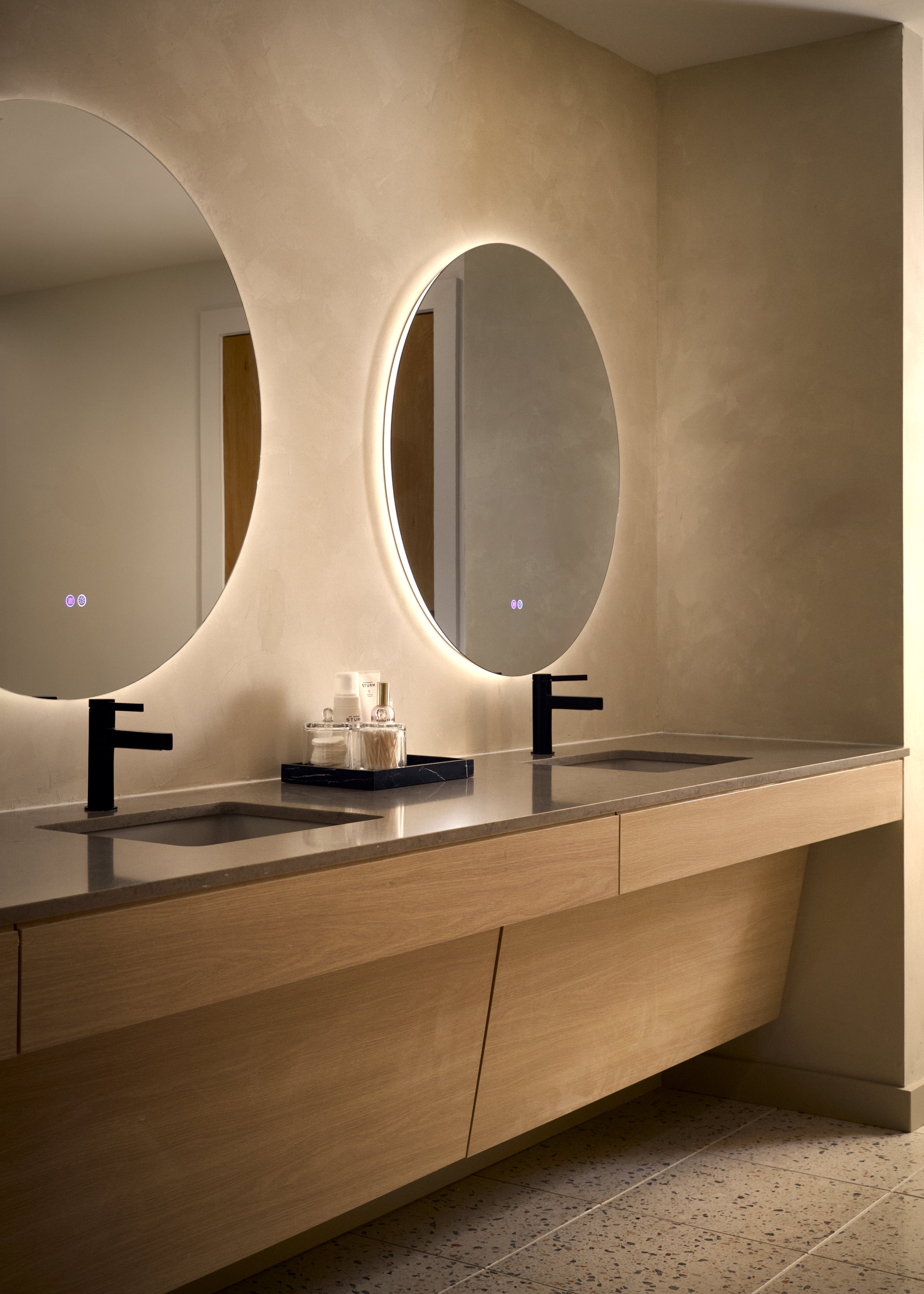 Natural wood cabinetry anchors the space, balancing sculptural simplicity with functional storage, while integrated lighting highlights clean lines and thoughtful detailing throughout. Organic materials and warm finishes work together to create a serene atmosphere—one that supports focus, movement, and mindfulness without distraction.