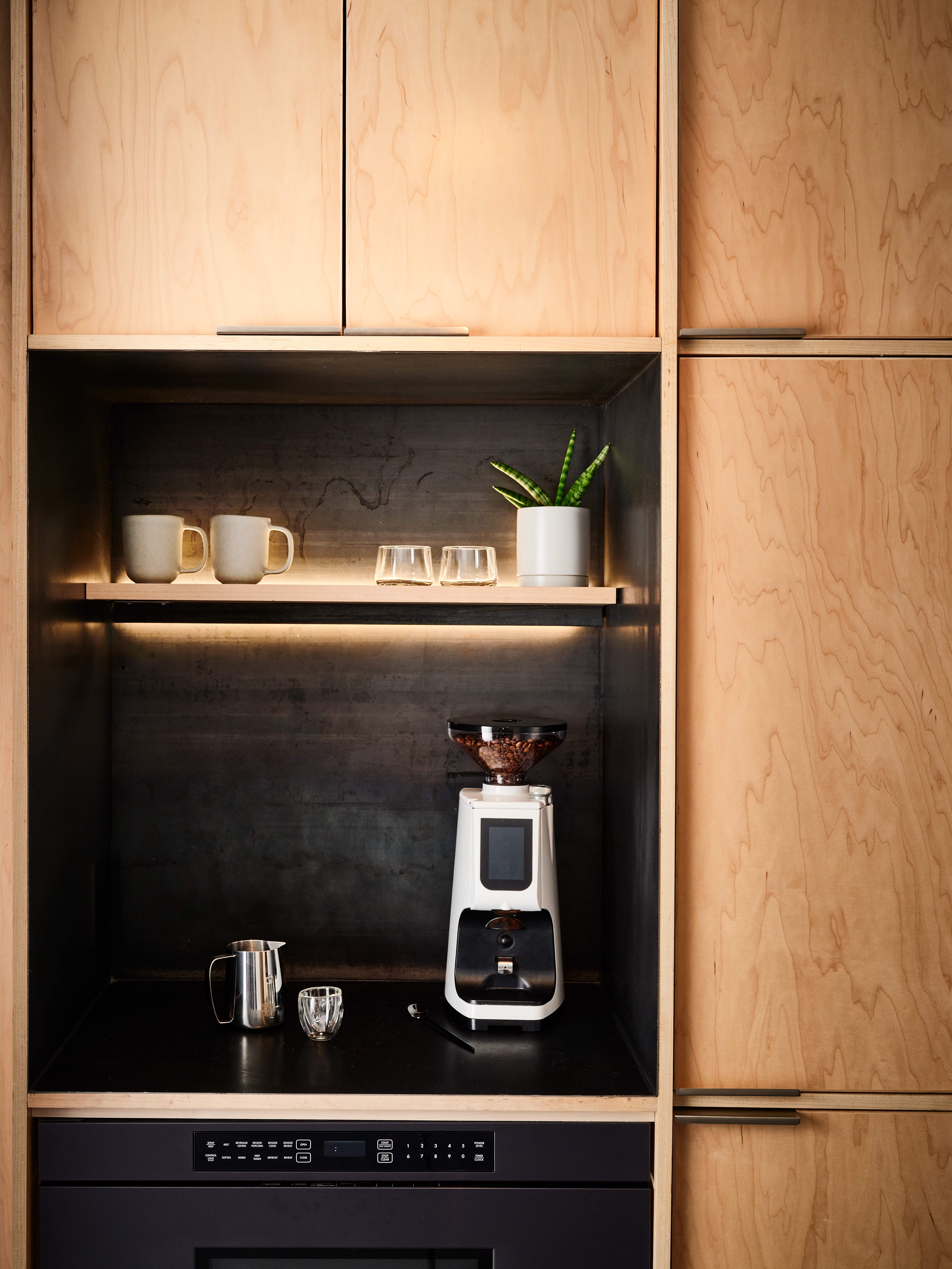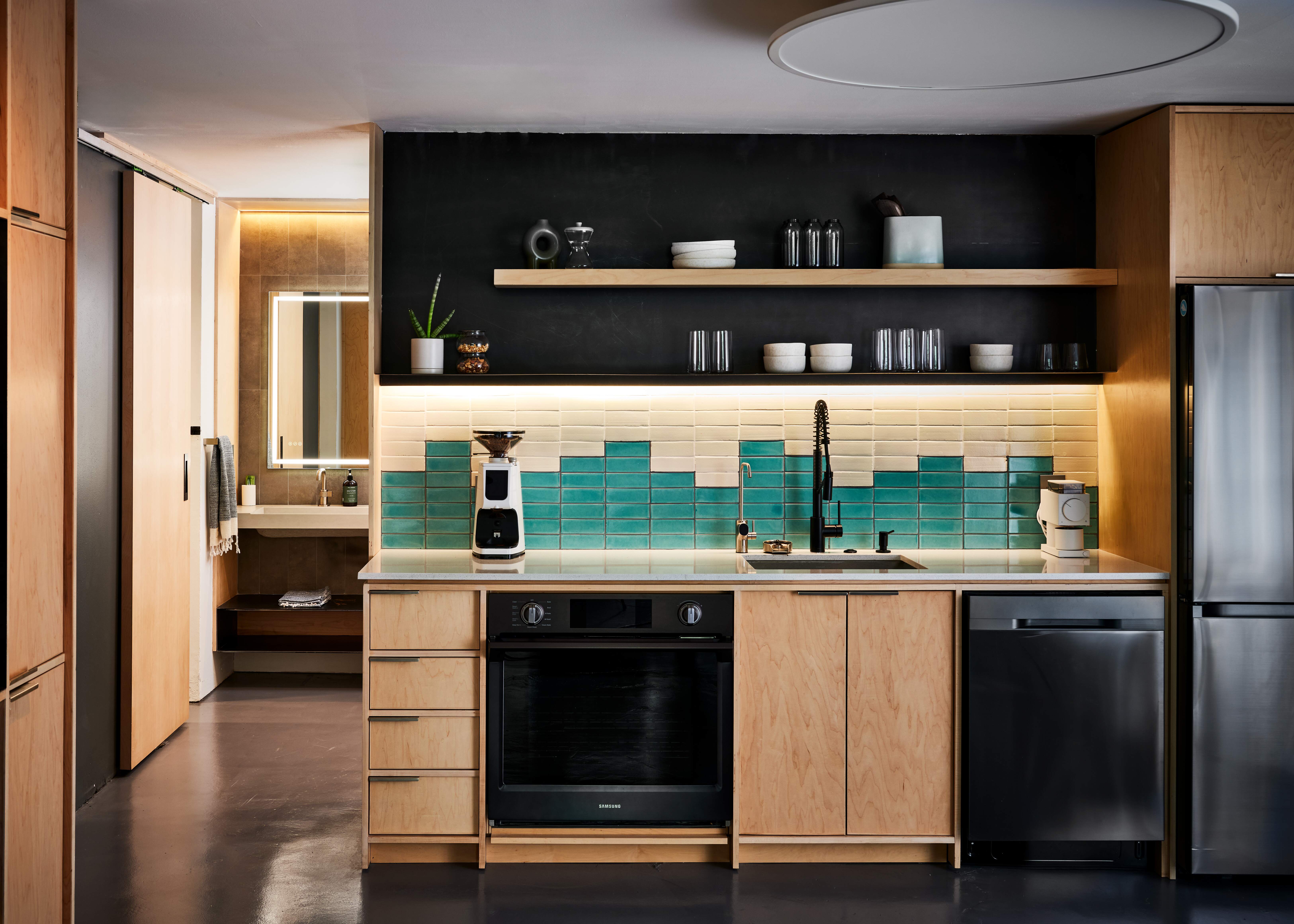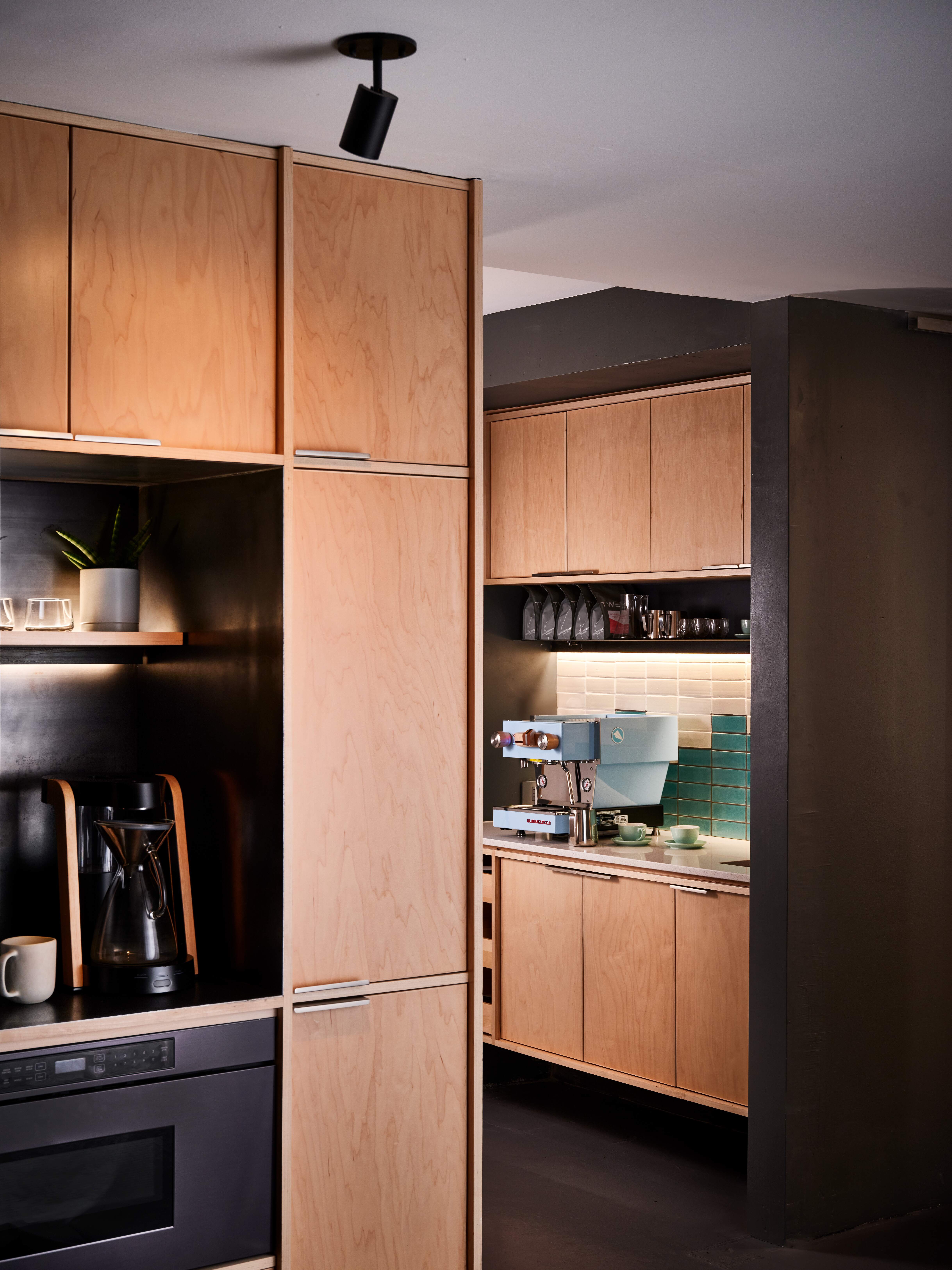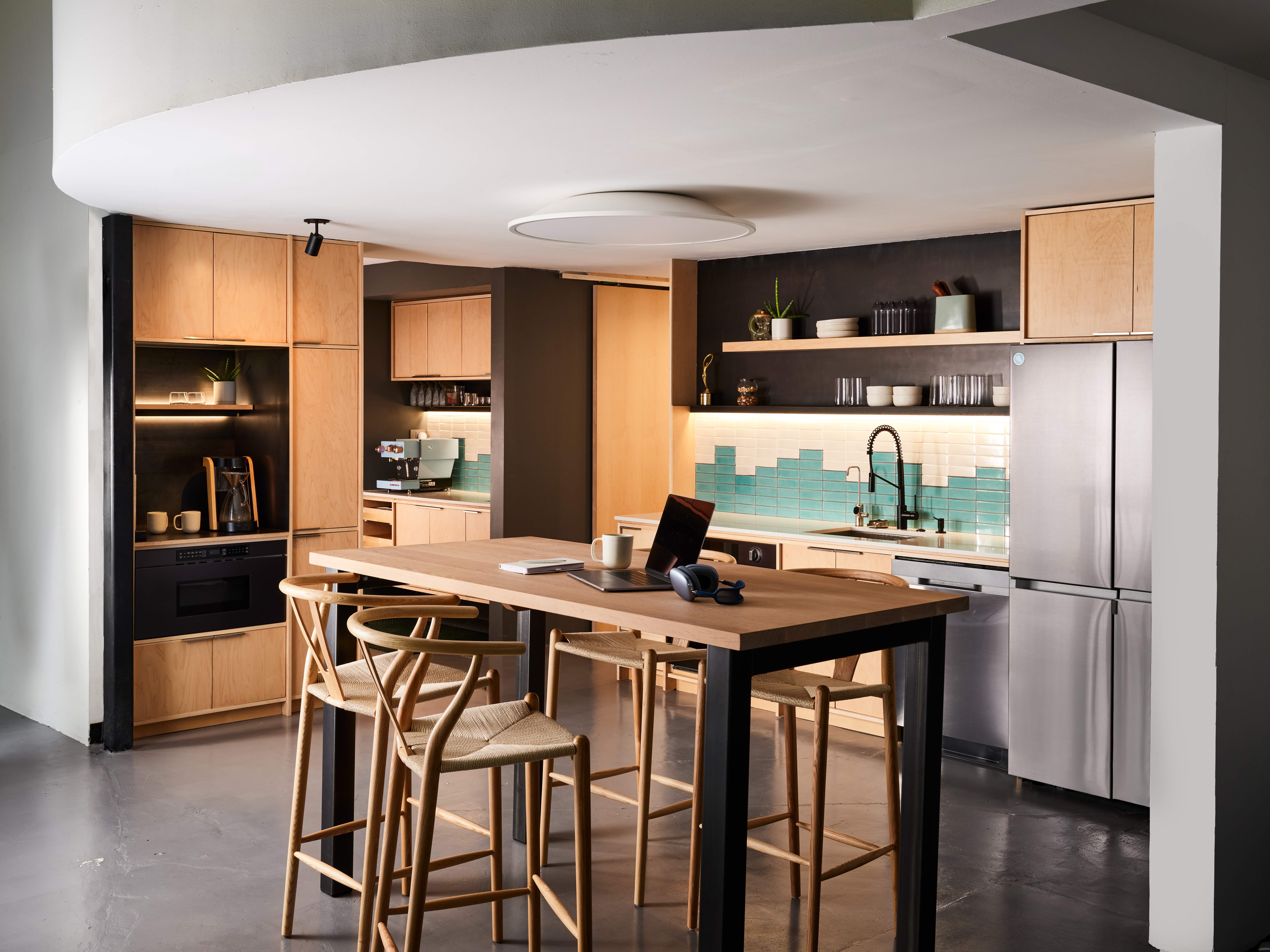 Back in the day, this was the studio where fashion models would be photographed for Neiman Marcus content. As we walked through the space the amount of gear and cases was dominant. We have learned that a space always tells you what it needs, in this case functional storage! We designed a wall of white oak storage that would accommodate all the different sizes of cases with a library rolling ladder. There was a super cool art piece in the space, and we proposed integrating it with the oak millwork. All the tones of blue and tan really tied it all in. Next to is a spiral staircase that leads you to one of the coolest offices of the space, it has the view to it all.This visit was happening during COVID times. Bryce emphasized how important it was to create cool spaces for people to gather. He said “When the time comes, I want people to feel excited about coming back” so we designed a moody kitchen and coffee bar. The design is bold, just like the work they do. We combined natural materials like oak and steel, accentuated by a gradient backsplash that mimics the soundboard that Paperlyte uses for their work. Bryce had fun bringing in the latest barista machines!