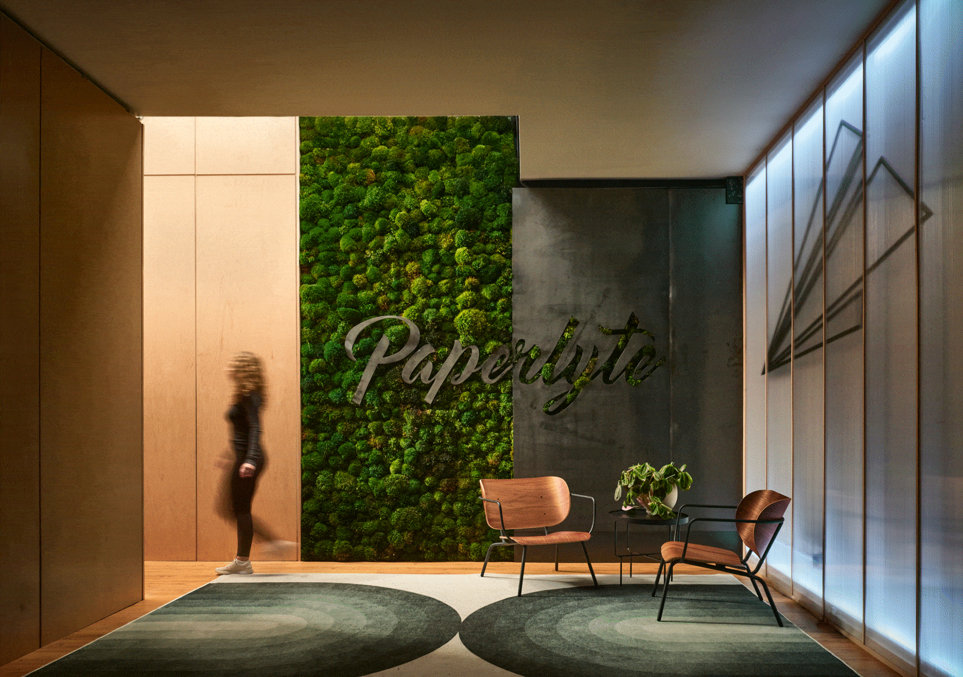 We wanted the entrance to feel like an experience. Lined with skylights the maple wood walls leading you into the space until you arrive at a live moss wall (that purifies the air and makes your heart smile). The backdrop is a polycarbonate wall that is lined with LED color changing lights. This wall has their logo “a paper airplane.” Now that this project is done, our wishes are that with every project they do, they go further and make people smile, just like a paper plane.
