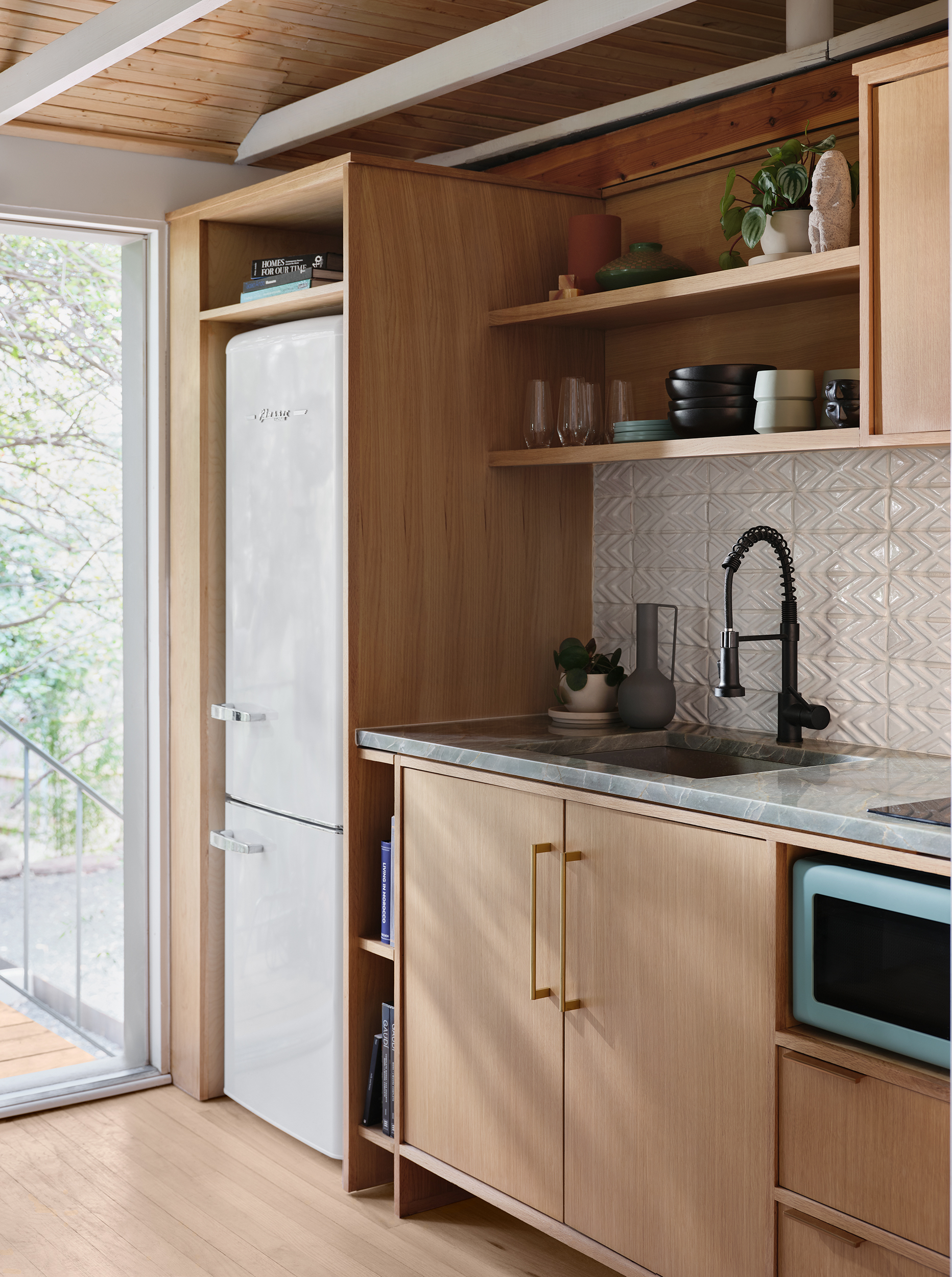 On the inside, the combination of new wood, old wood, raw steel and vibrant green and blue concrete tile is our happy place. This space really represents our core design beliefs. We want to embrace what exists and elevate it with thoughtful design. We topped it off with a gorgeous, one of a kind mural by local artist Johanna Torres.